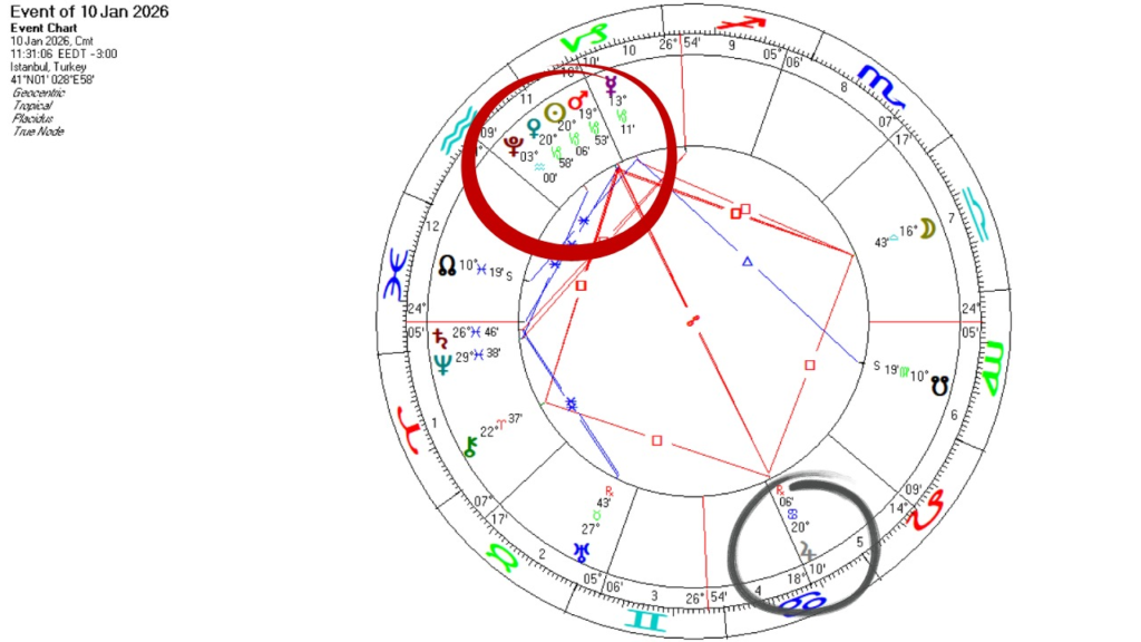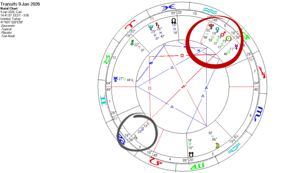 5 Ocak haftası için astrolojik haritalarda dikkat çeken görünümler oldukça ciddi. Son iki haftadır işler gittikçe ciddileşiyor demiştik ki süreç gittikçe daha da ciddi bir hal almaya doğru ilerliyor. İçinde bulunulan şartlara ciddi bir odaklanma gereği ve ihtiyacı doğuracak olan etkiler 5 Ocak haftası için hem haftanın tamamına yayıldığı gibi, kesinleşen açılar ile 8, 9 ve 10 Ocak günleri için keskin bir hal alıyor. Görselde haritalarda işaretli olarak görebilirsiniz. Venüs, Güneş, Mars kavuşumları, Jüpiter karşıtlığı yaklaşan etkisini bu hafta en üst safhaya çıkarıyor. Bu ne demek, daha önceki “İşler Ciddi” başlıklı haftalık yazımda yazdığım gibi,